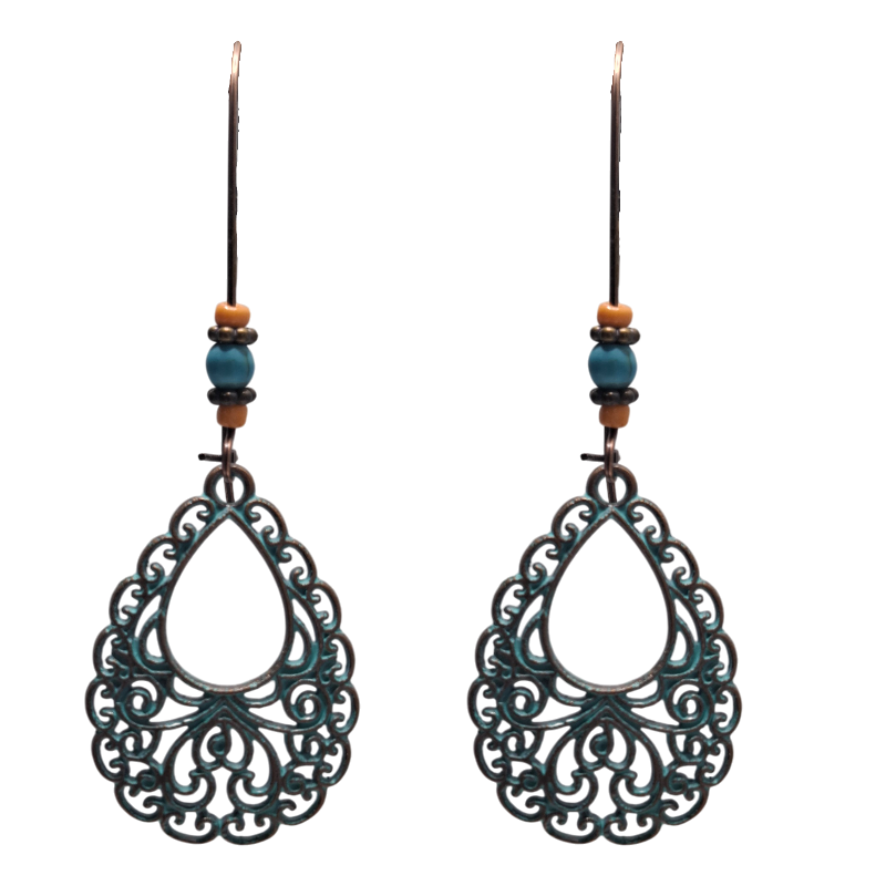Bohemian Teal Filigree Teardrop Earrings – Vintage Lightweight Dangle Jewelry with Bead Accents for Women