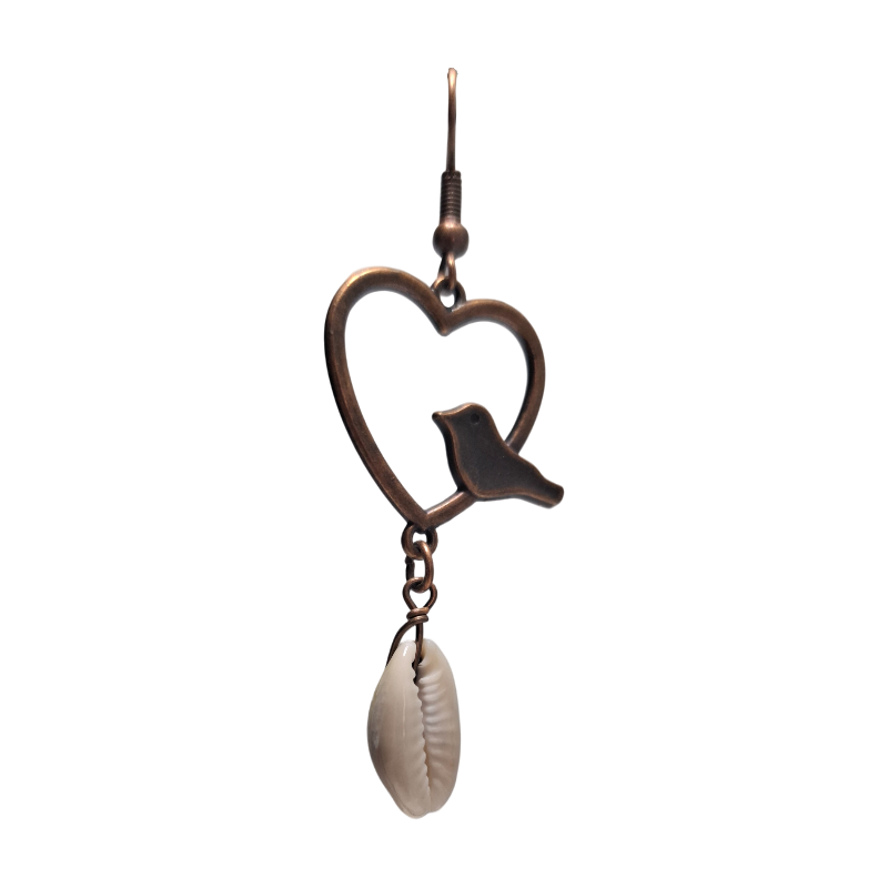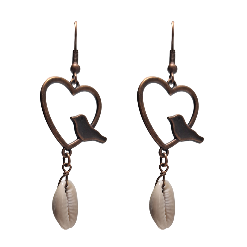 Bring a touch of romantic boho charm to your look with these handcrafted heart and bird dangle earrings, finished with a natural seashell drop. The antique bronze heart frame with a perched bird creates a whimsical, nature-inspired design, while the seashell adds a coastal vibe, making them a unique statement piece.